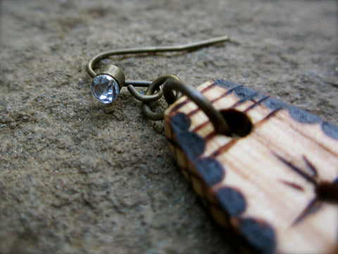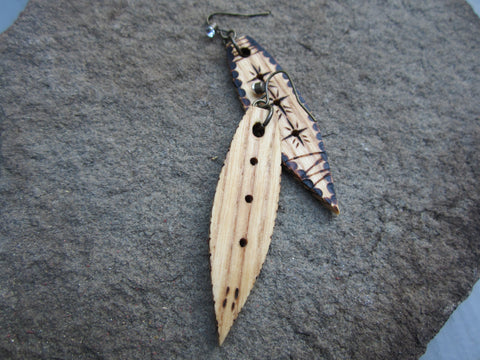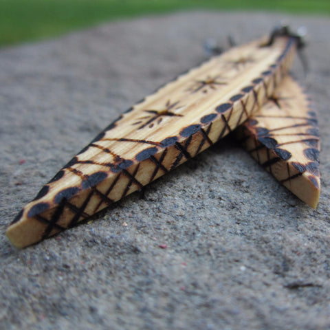 This pair falls into my Flip-Flip design. Meaning, if you switch which ears you are wearing them in, it will display a different side with different detailing! The details on this pair are subtle and nature inspired. Using my burning tools, I detailed with foliage-inspired markings that on some sides are quite wispy!
